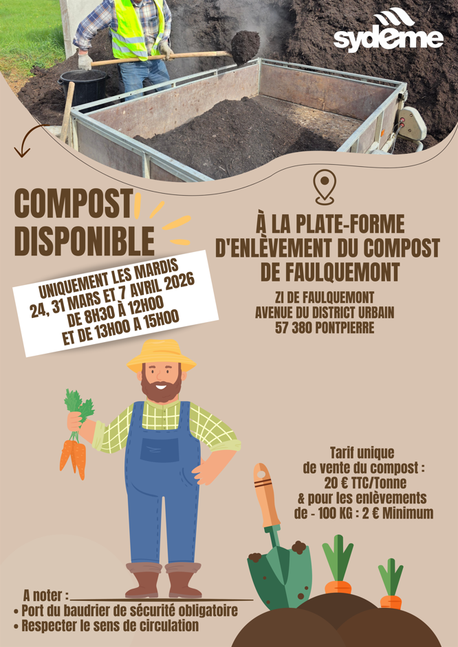 Ouverture exceptionnelle de la plate-forme d'enlèvement du compost de Faulquemont les mardis 24 et 31 mars et mardi 7 avril 2026 de 8h30 à 12h00 et de 13h00 à 15h00.
